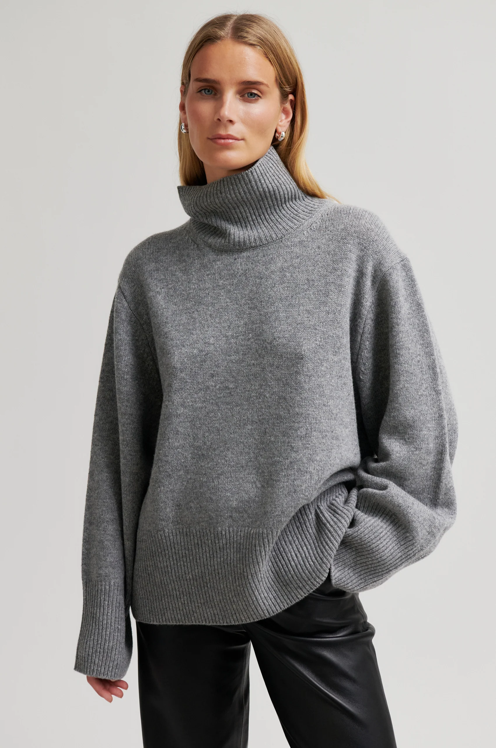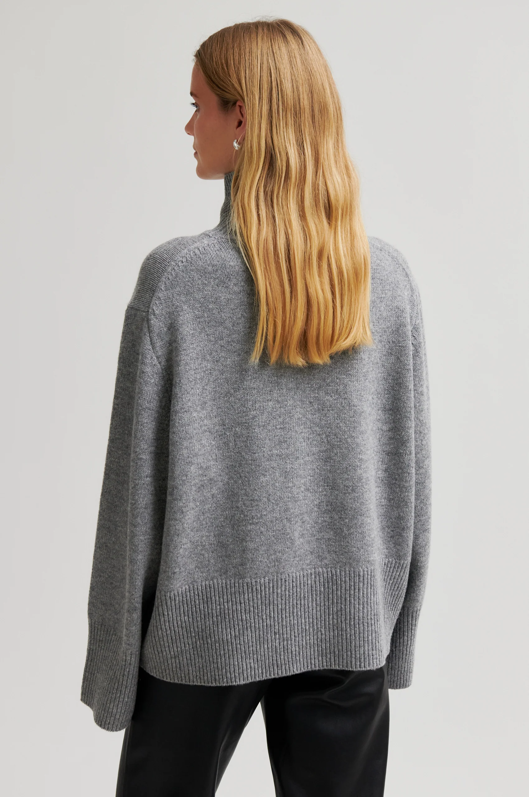 Grå melange Second Female polotröja. Tröjan är tillverkad i mjuk ull. Har polotröja och nedsänkta axlar med vida, långa ärmar. Ribbad halsringning, ärmslut och nederkant. Extra vid passform.
