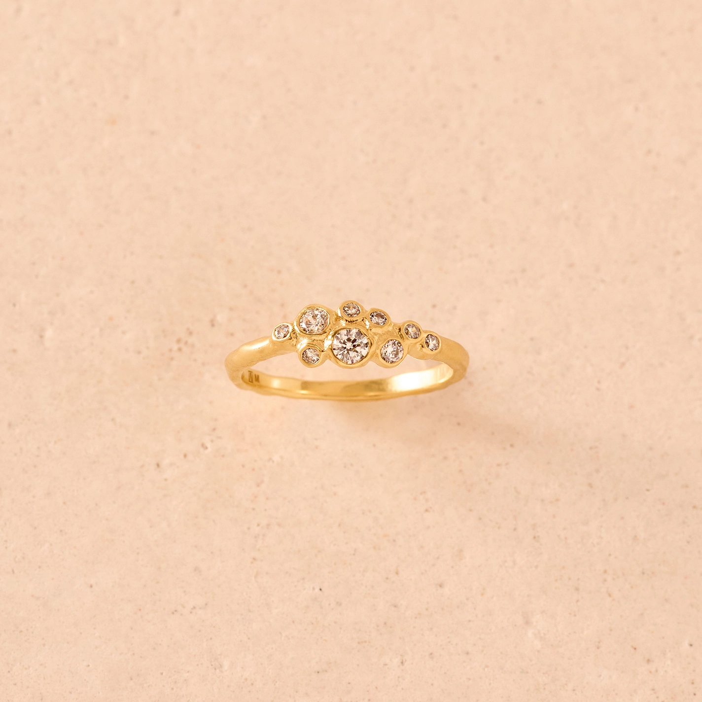 Atys tunna klusterring har en organisk och tidlös charm med oregelbundet inlagda vita stenar. Den fångar den vilda skönheten där klippor möter havet.