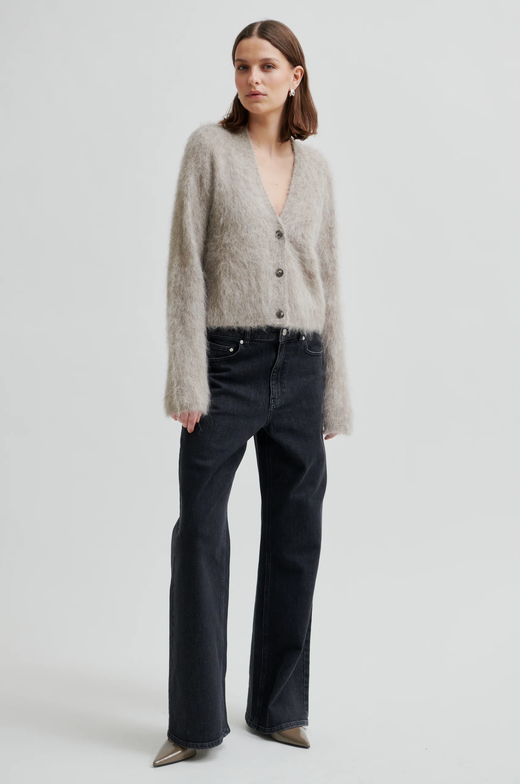 Långärmad kofta från Second Female. Koftan är tillverkad i en mjuk, fluffig alpackablandning. Har V-ringning och knäppning. Långa ärmar. Normal, något boxig passform.