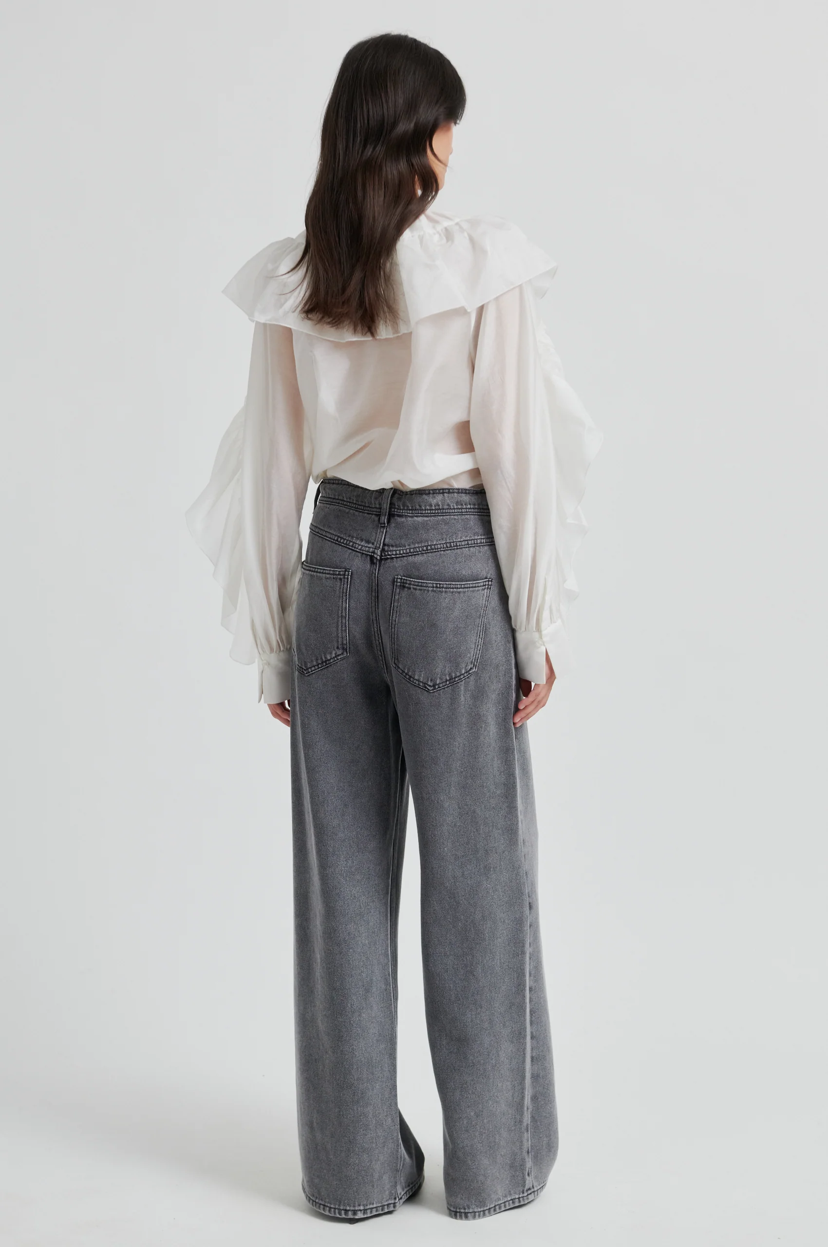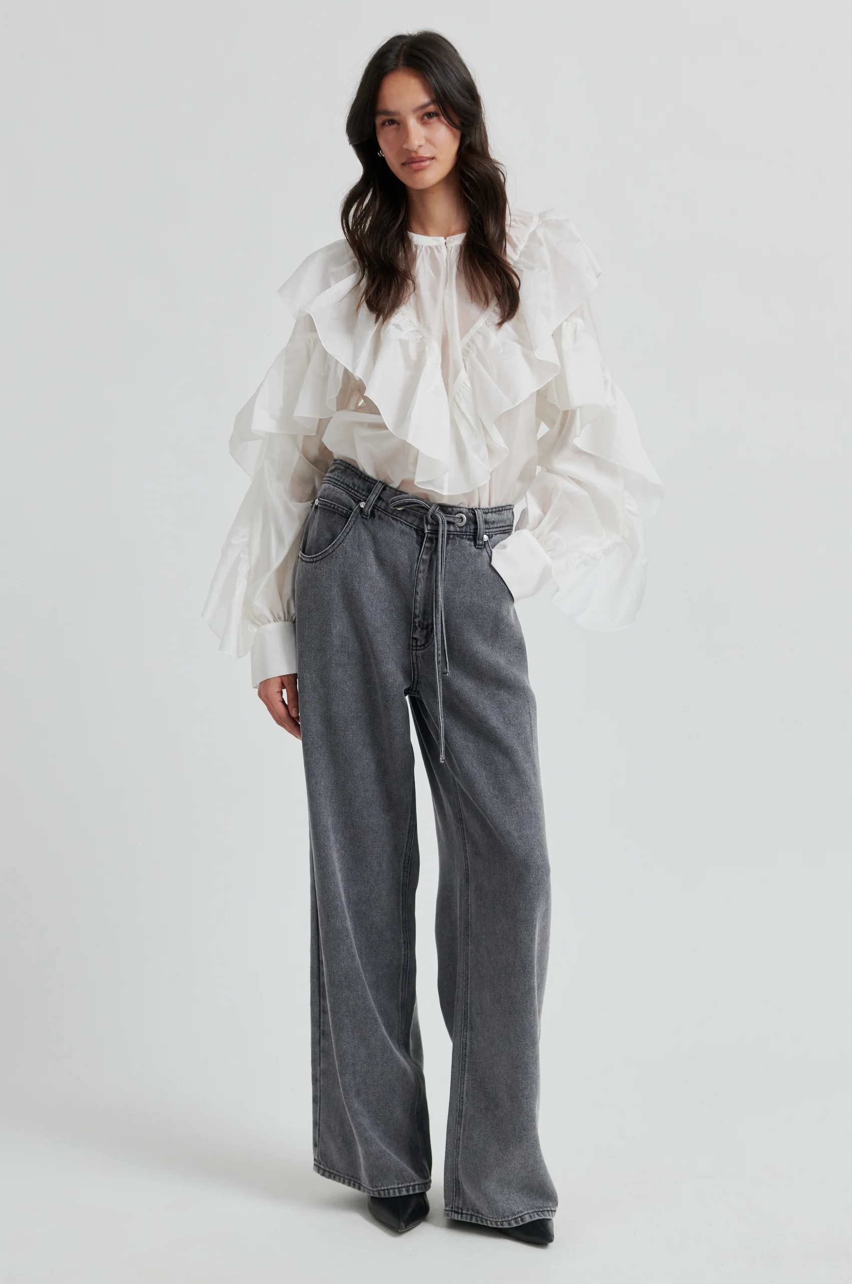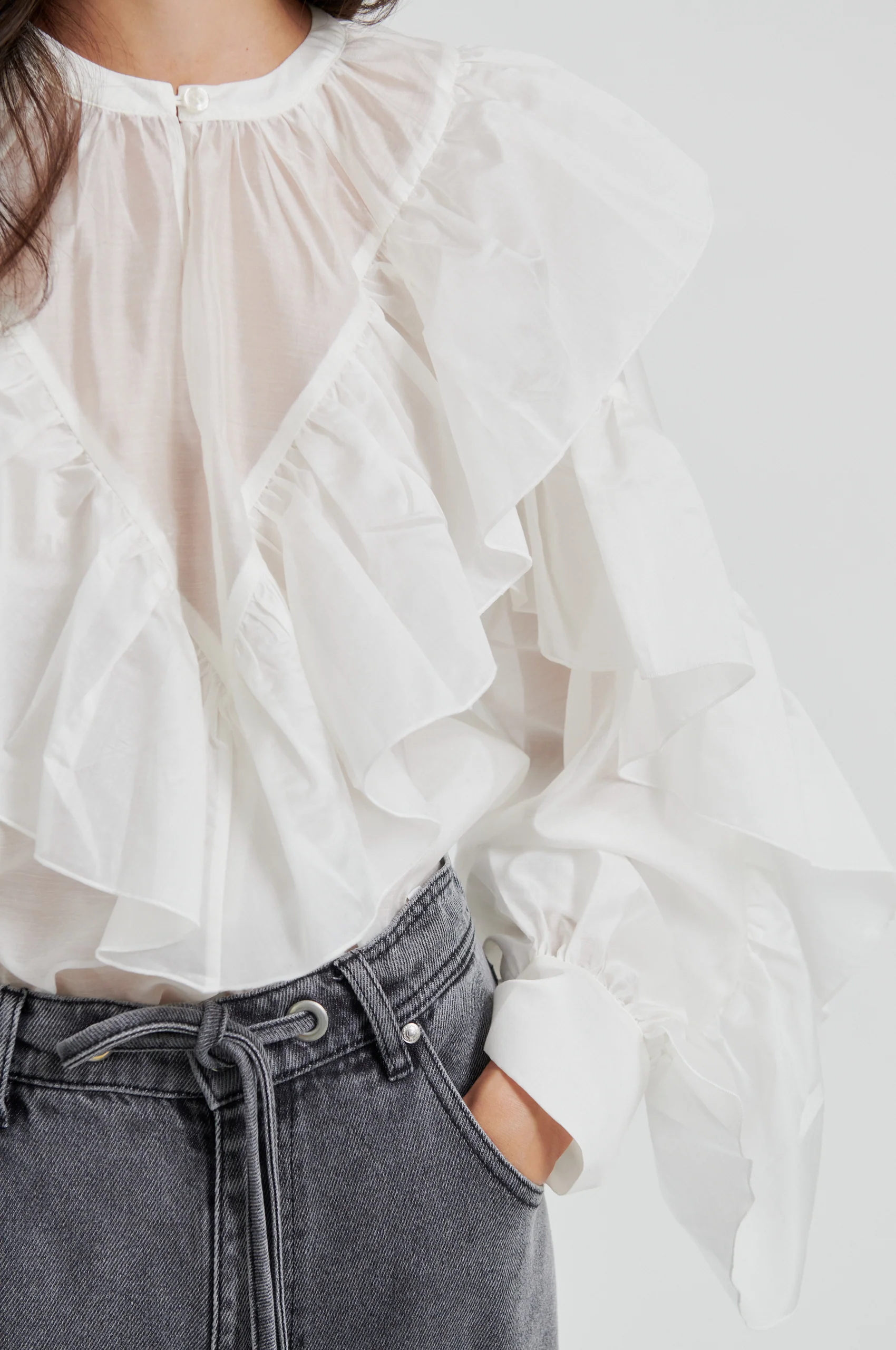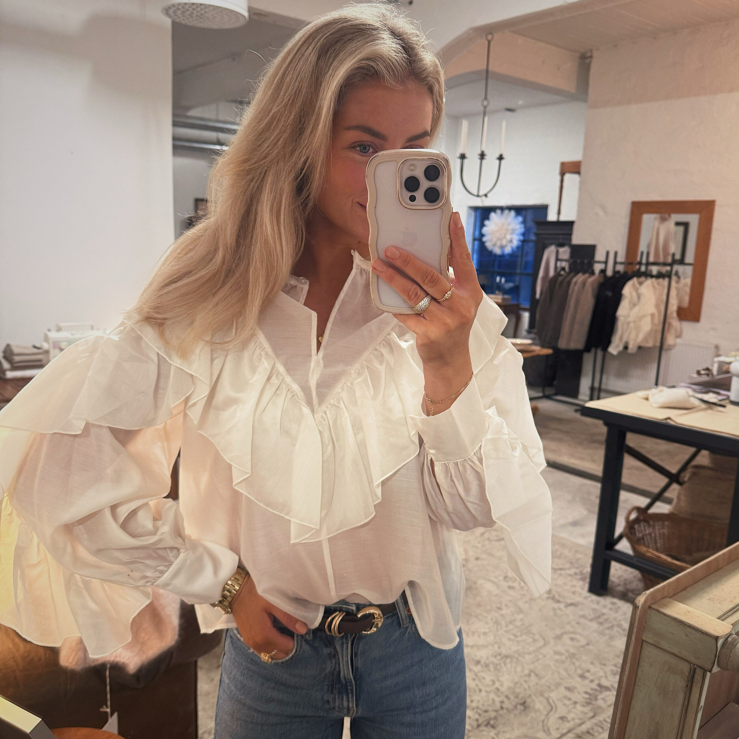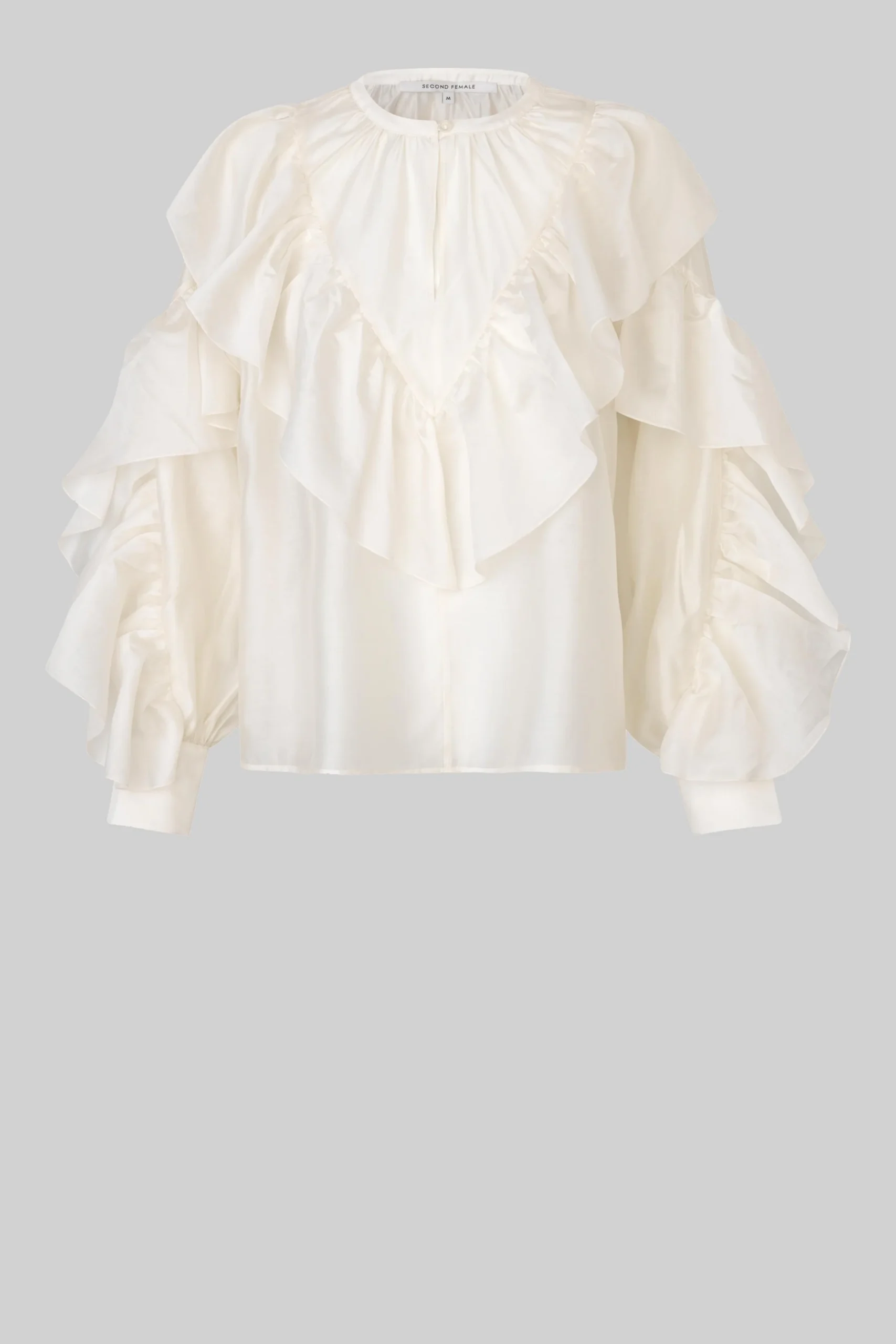 Volangblus från Second Female. Blusen är tillverkad i ett lätt, halvtransparent tyg. Har en nyckelhålsöppning med knappknäppning framtill. Sneda volanger framtill och på ärmarna. Långa ärmar med knäppta ärmar i ärmsluten. Avslappnad, luftig passform.