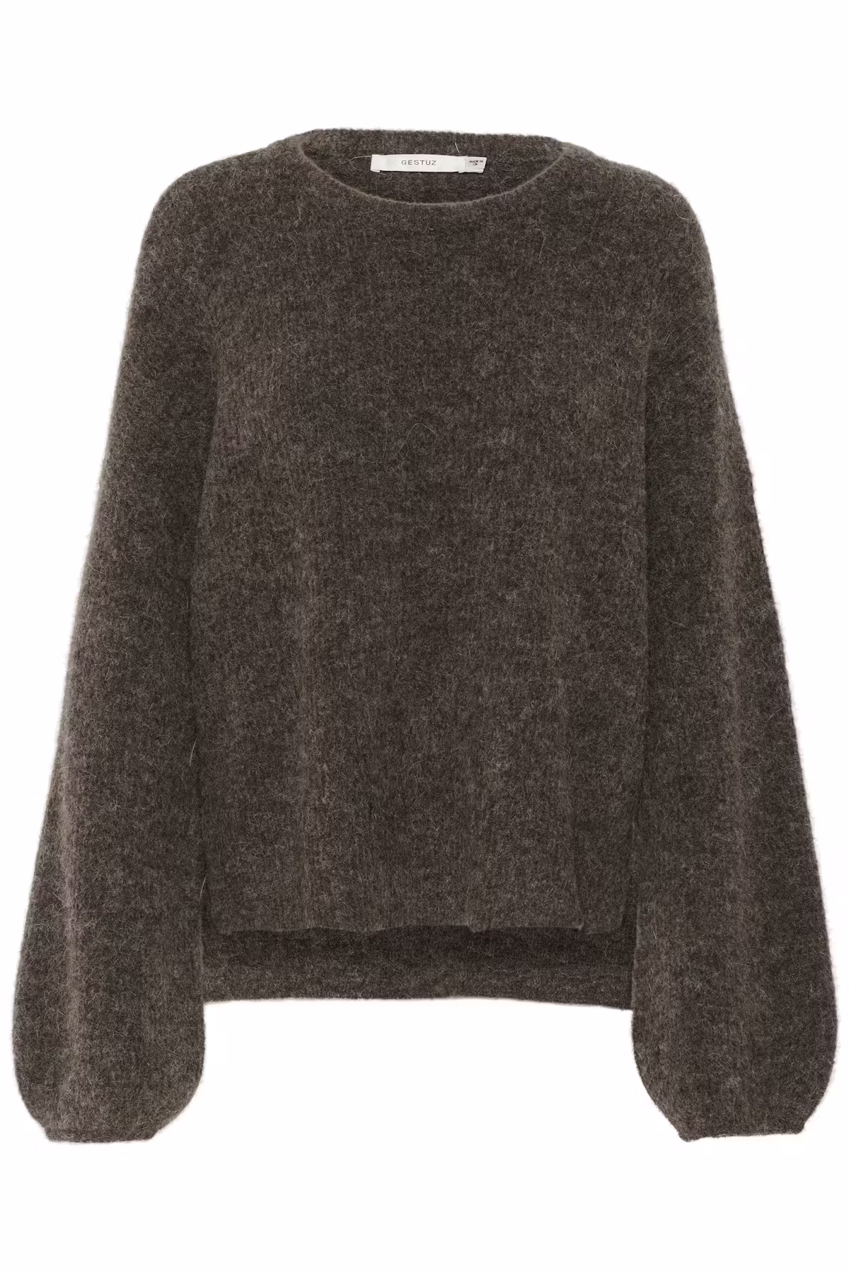 Stickad tröja med rund halsringning och långa, voluminösa ärmar. Passformen är avslappnad med ribbade kanter vid nederkant och ärmslut.