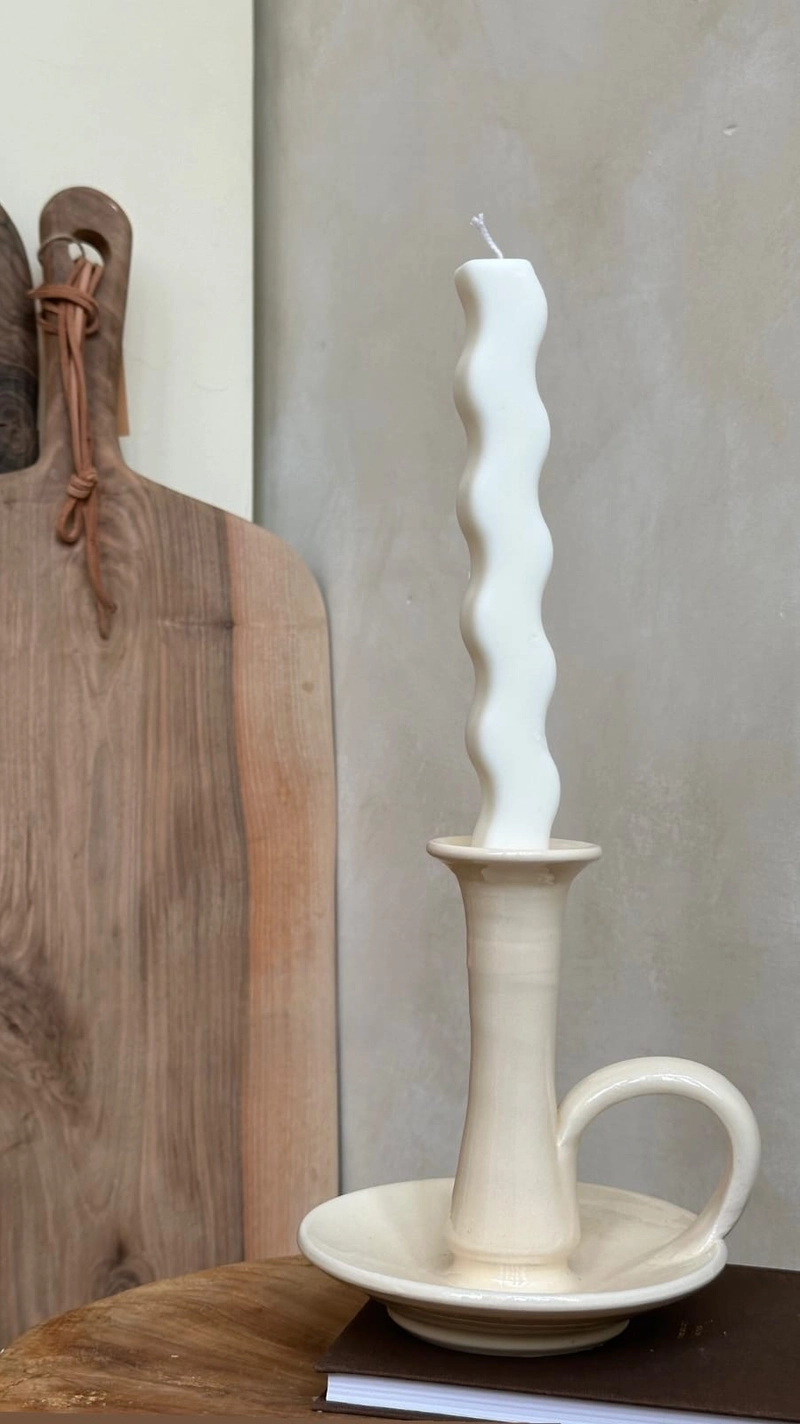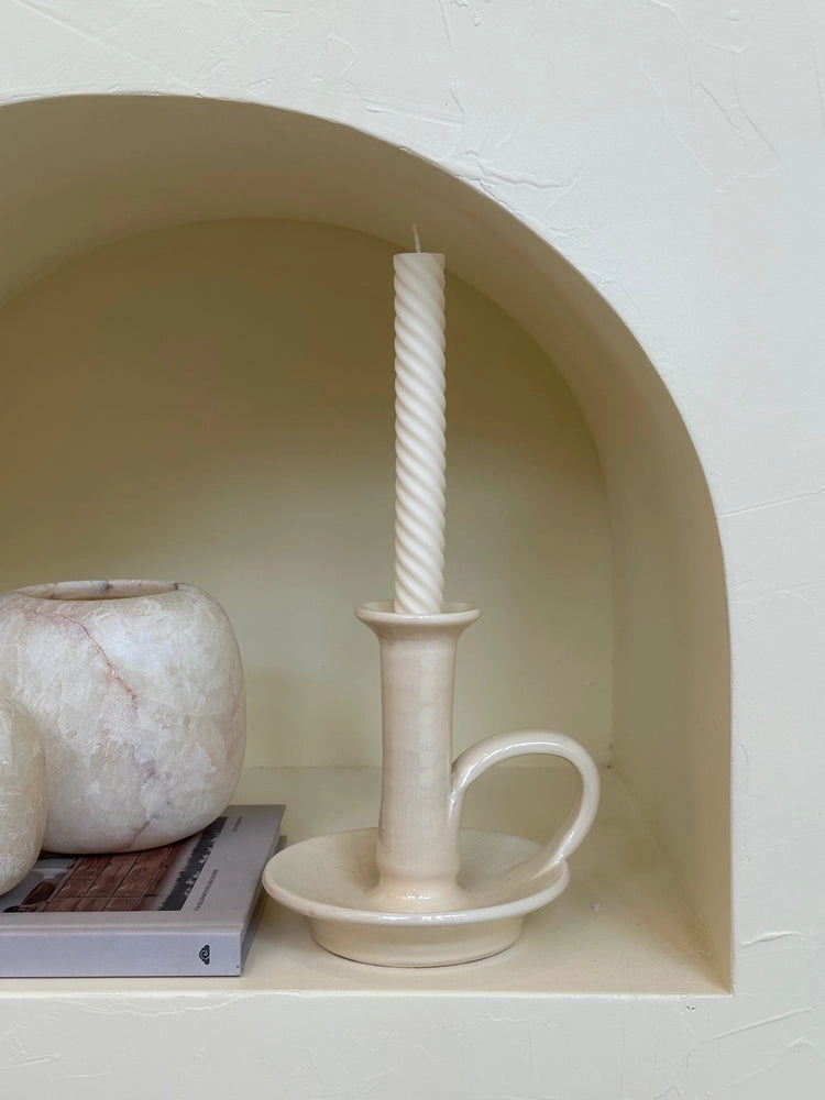 Vacker handgjord ljusstake i krämfärg.