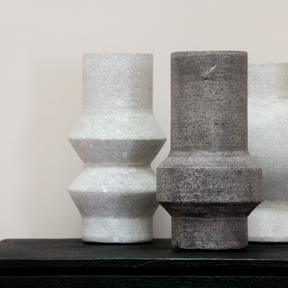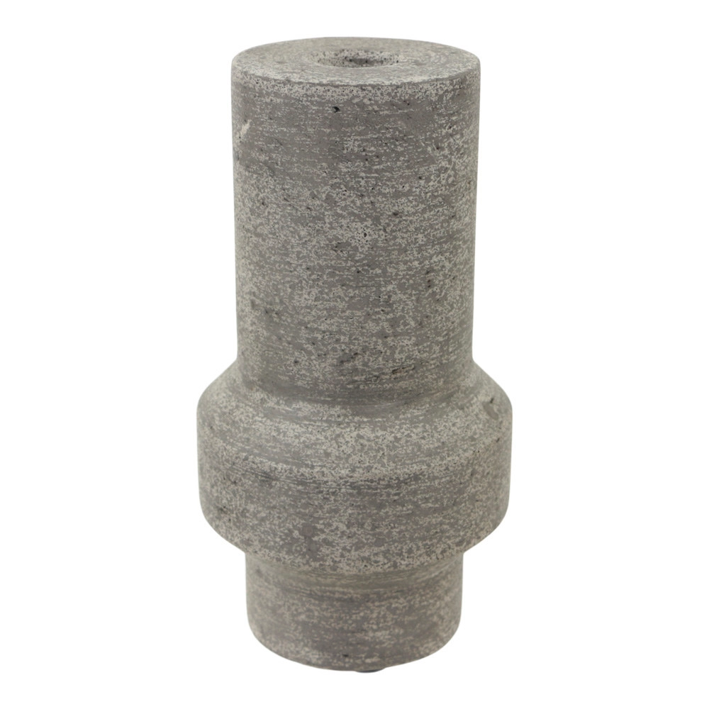 En stilren och skulptural inredningsdetalj med en rå, stenliknande yta i grå toner. Formen är modern men tidlös och gör sig lika fin ensam som i en grupp på ett sidobord, hylla eller matbord.