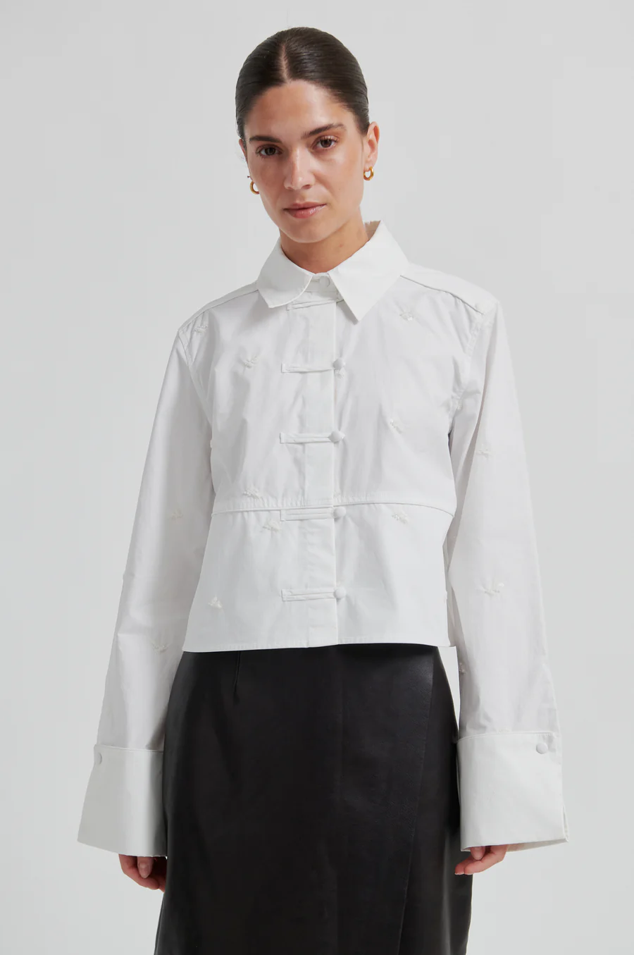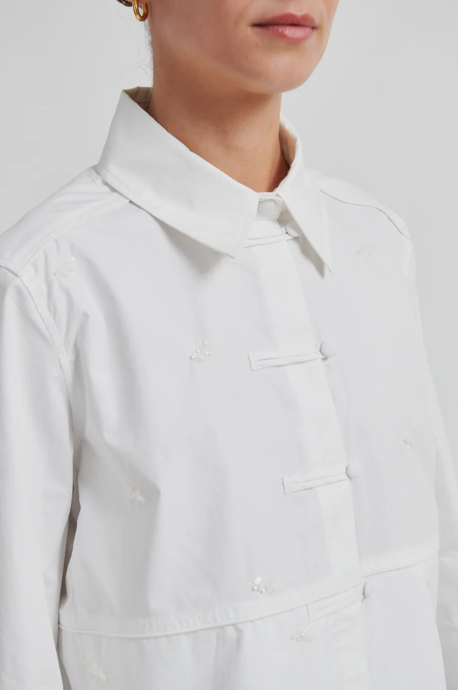 Second Female-skjorta med paljetter. Skjortan är tillverkad i slät bomull med paljett- och pärlutskåror. Har vanlig krage och knäppning med knappar och öglor. Långa ärmar med dubbla manschetter med knappar. Vid och boxig passform.