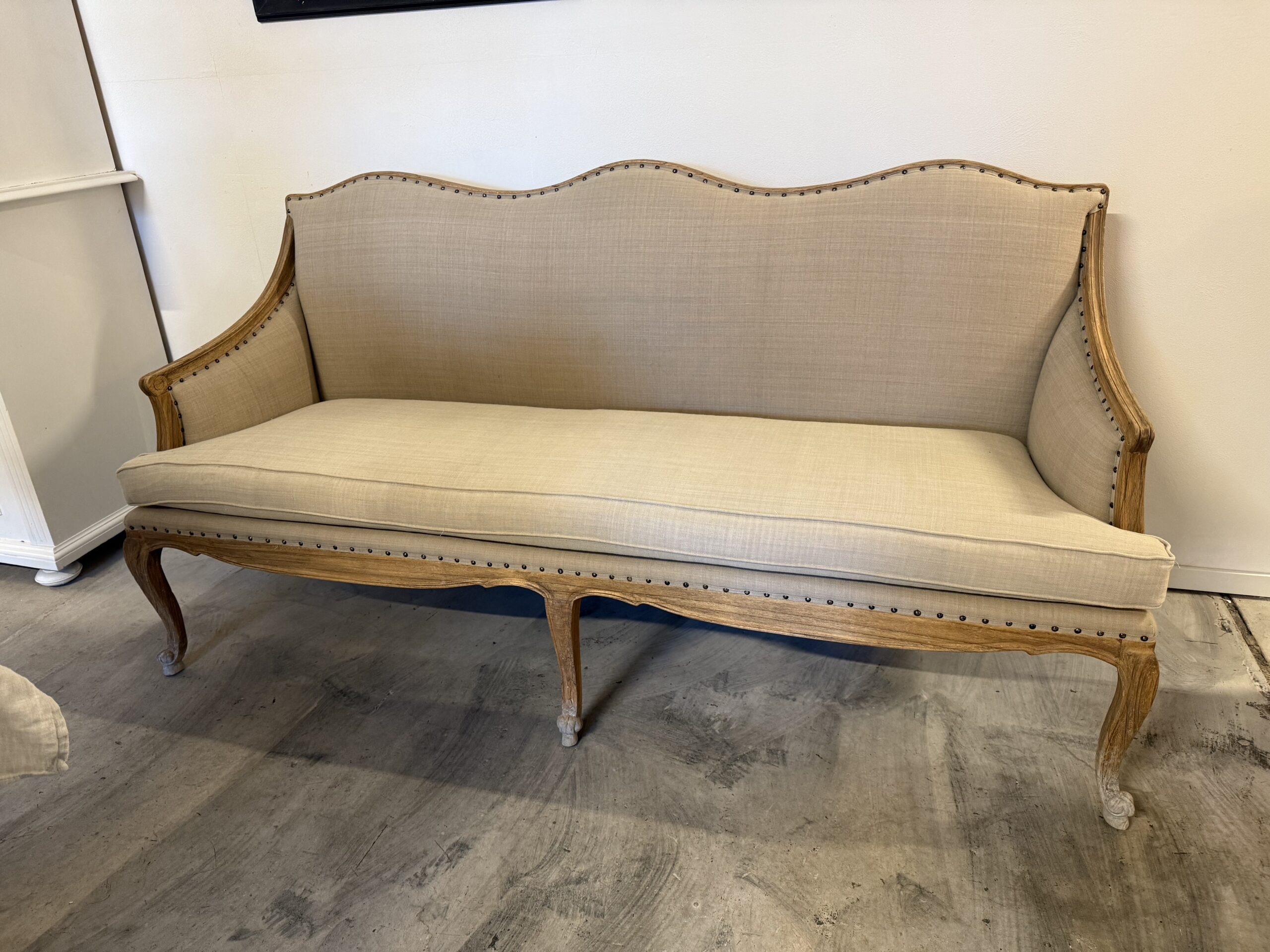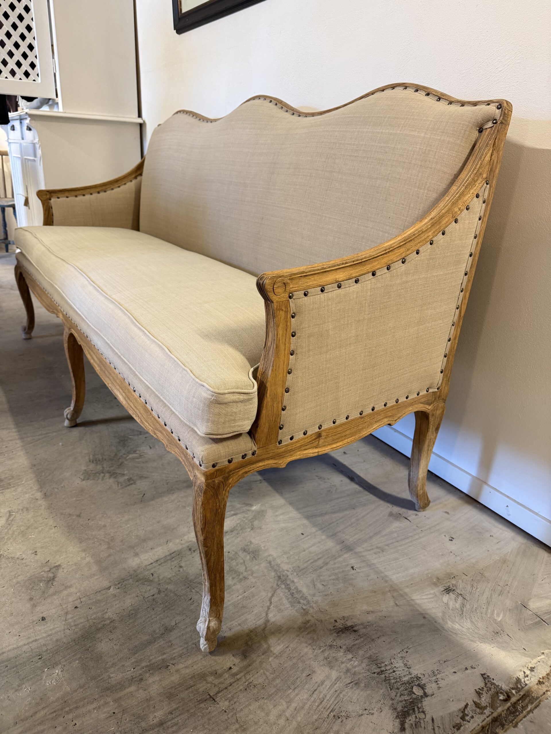 Stommen i massivt trä med vackert patinerade ben ger både stabilitet och karaktär, medan den generösa sittdynan erbjuder god komfort. En soffa som passar lika fint i vardagsrummet som i hallen, sovrummet eller som en elegant sittmöbel i butik eller ateljé.