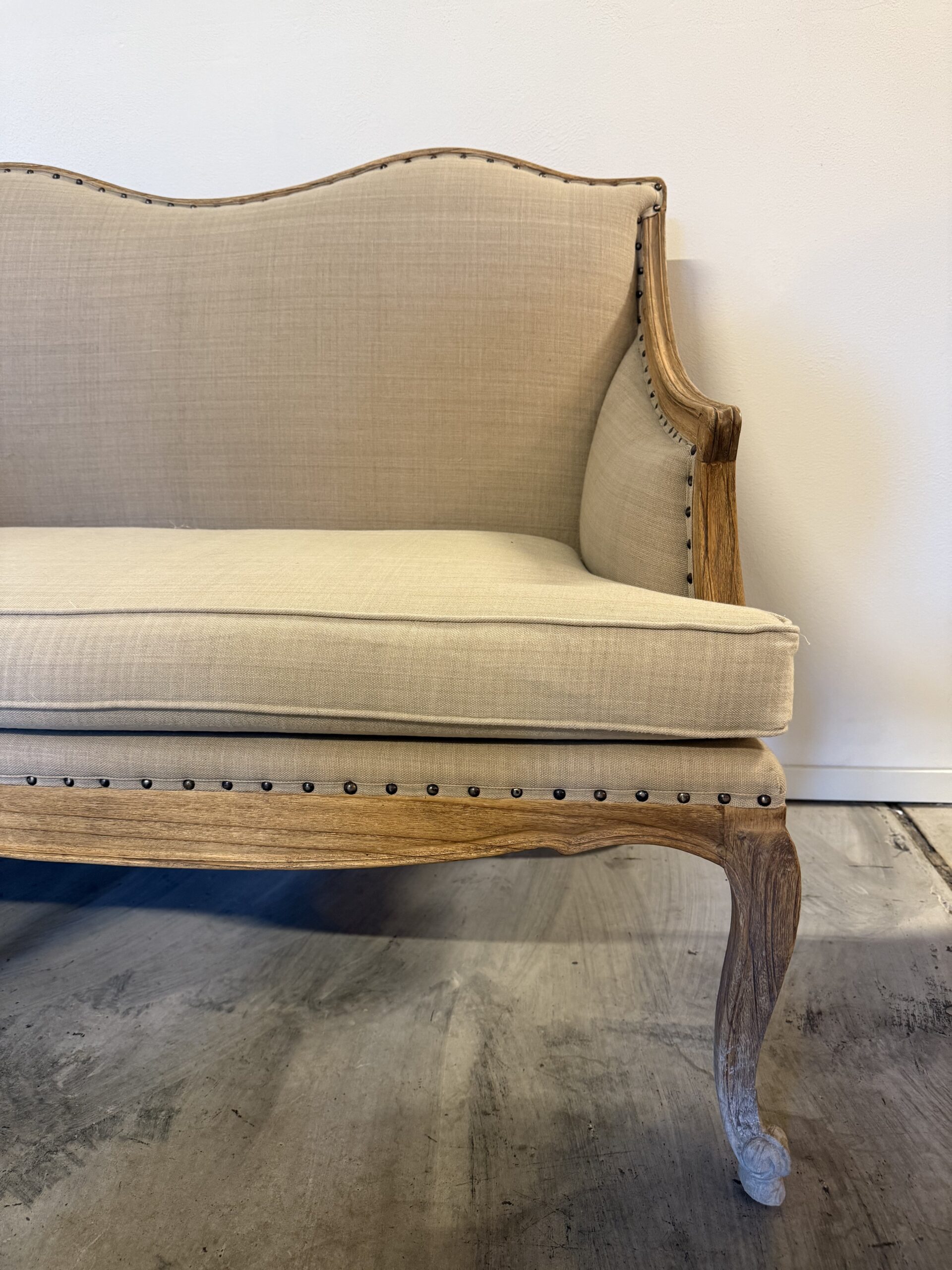 Elegant och tidlös soffa med klassiska former och gediget hantverk. Soffan har en vackert svängd rygg, mjukt rundade armstöd och dekorativa nitar som ramar in klädseln på ett smakfullt sätt. Den ljusa, neutrala textilen ger ett lugnt och exklusivt uttryck som smälter in i både moderna och mer traditionella miljöer.