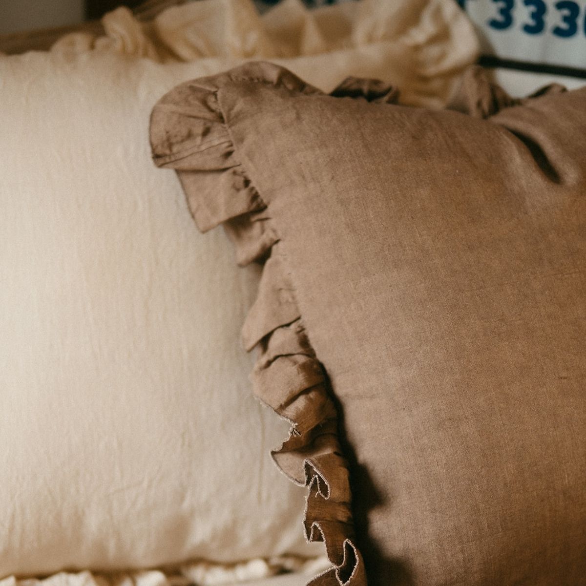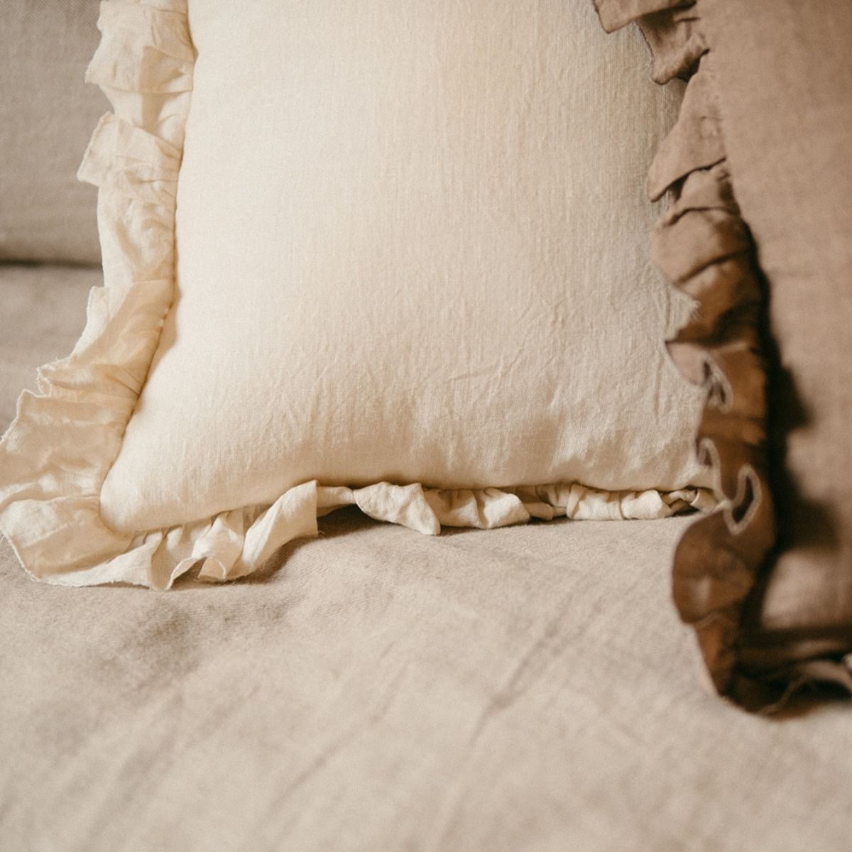 Denna kudde är en klassiker för att dekorera soffan eller sängen. Den är tillverkad av en blandning av linne och bomull, i  elfenbensvit färg. Kudden har volanger runt omkretsen som ger elegans och originalitet.